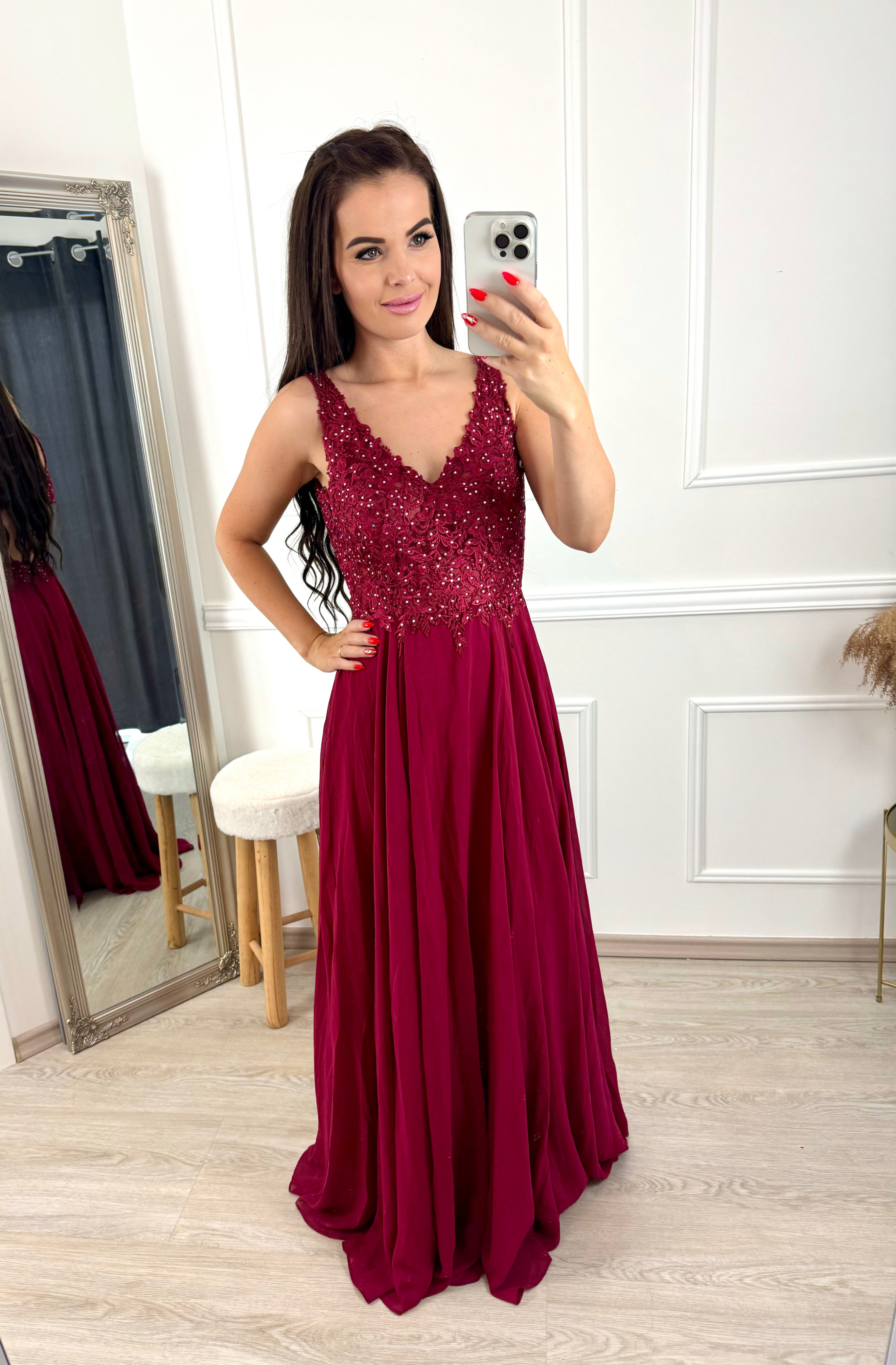 Dokonale padnoucí šifonové šaty, vhodné na svatbu, na ples Rozparek, vzadu zip a cvok nahoře posázené kamínky V případě zájmu o jinou velikost nás neváhejte kontaktovat   celý popis