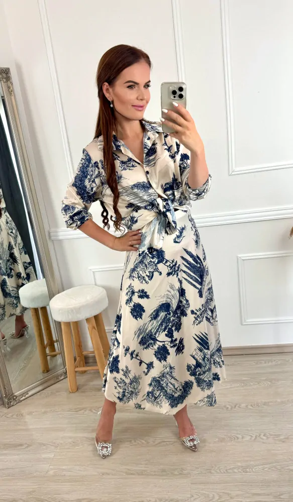 Krásná osminková saténová sukně ve stylu Dior motivu a ktomu ve stejném vzoru košile s dlouhým rukávem