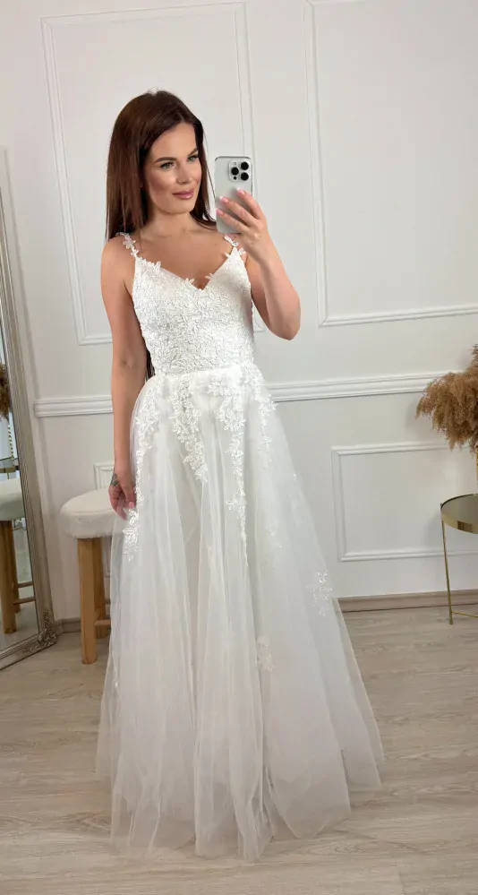 Jednoduché lehounké a splývavé svatební šaty lze nechat ušít i v jiných barvách jako plesové odstín ivory Záda na zip a šněrování, díky čemuž přizpůsobíte velikost hrudníku Velikost 32-46 Dodání 4-6 týdnů celý popis