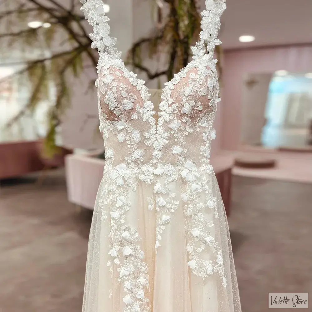 Něžné krajkové svatební šaty  Zapínání na zip Na fotce jsou v odstínu champagne, možno objednat i v Ivory nebo čistě bílé (barvu uveďte při objednávce v poznámkách) Velikosti 32-46 Dodání 4-6 týdnů celý popis